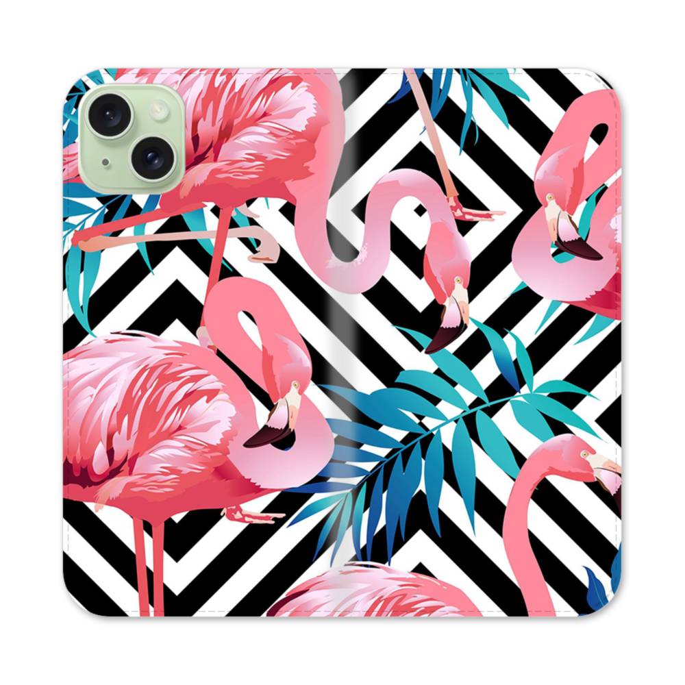 Stripes Background Pink Flamingos iPhone 15 Plus Flip Case has front and back covers providing full protection for your iPhone 15 Plus