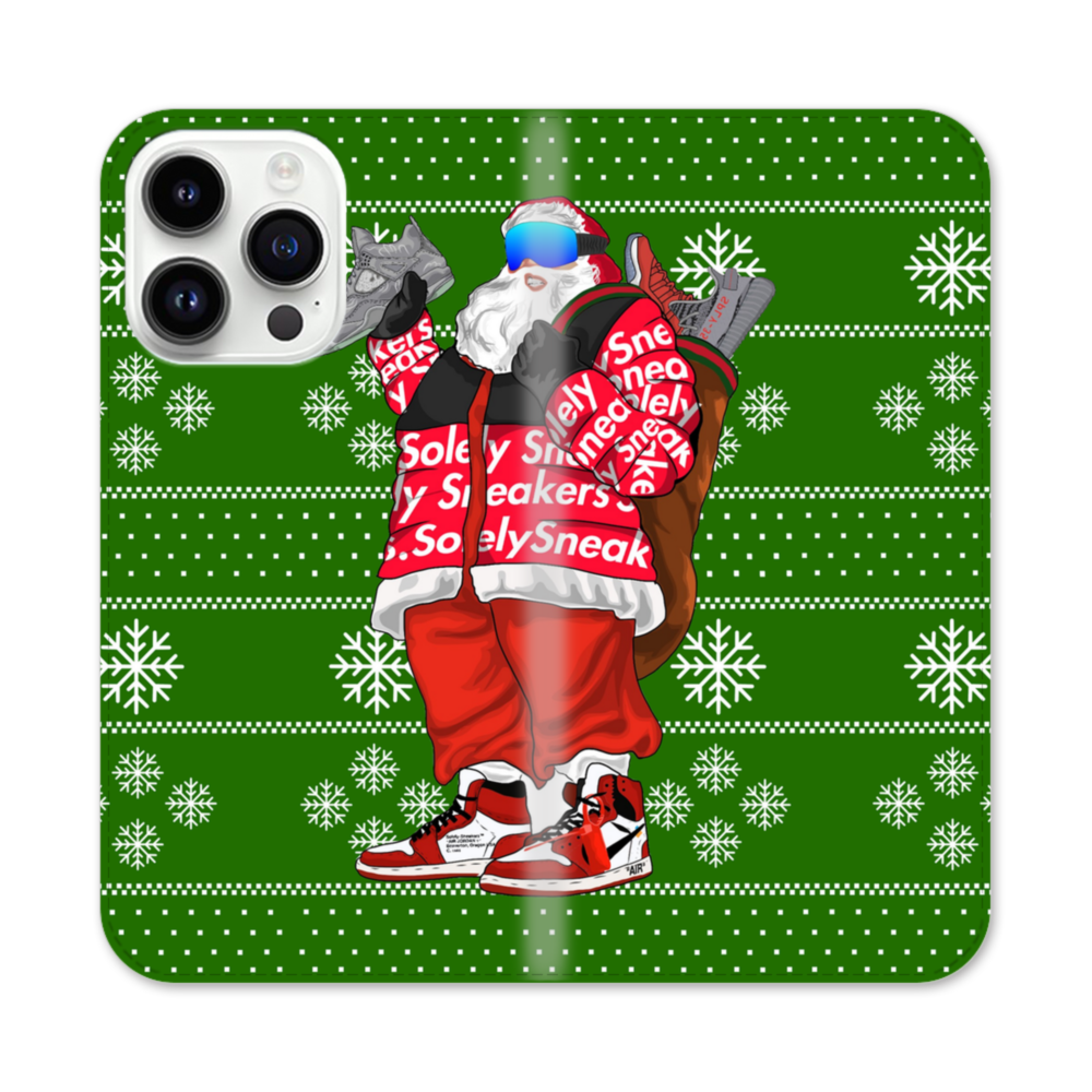Santa Sneakers iPhone 14 Pro Max Flip CaseThis Santa Sneakers iPhone 14 Pro Max Flip Case protects the back and screen of your iPhone 14 Pro Max with a card slot on the inside front cover. Print extends to both front and back sides.