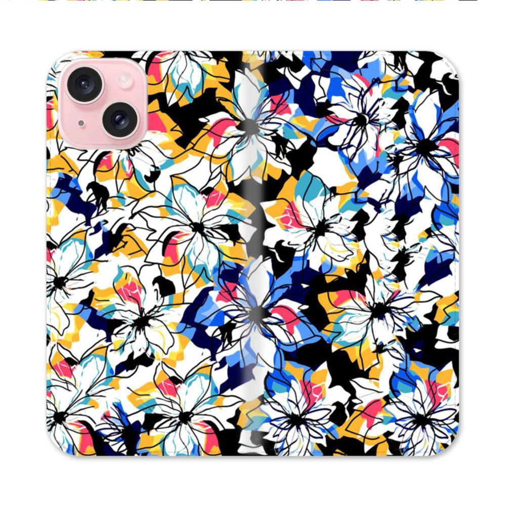 Floral Chaos iPhone 15 Flip CaseThis Floral Chaos iPhone 15 Flip Case protects the back and screen of your iPhone 15 with a card slot on the inside front cover. Print extends to both front and back sides.
