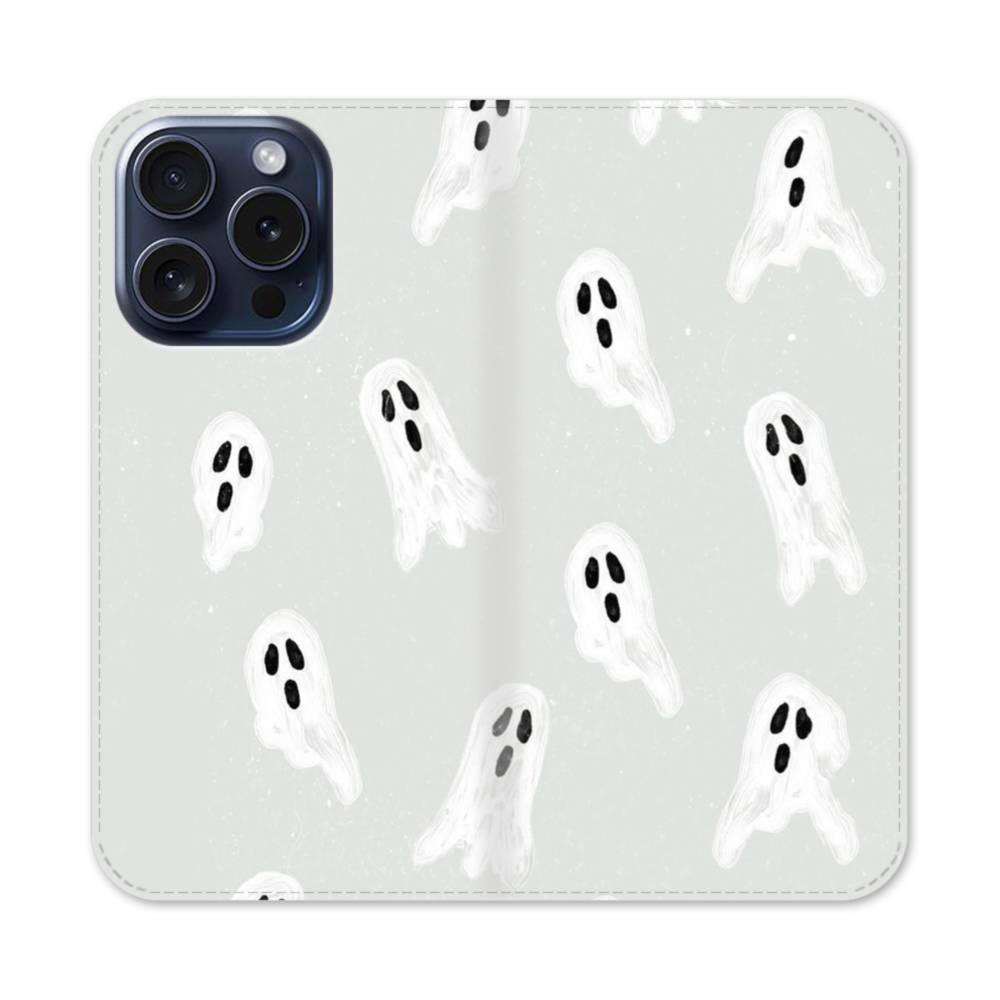 Cute Ghost iPhone 15 Pro Flip CaseThis Cute Ghost iPhone 15 Pro Flip Case protects the back and screen of your iPhone 15 Pro with a card slot on the inside front cover. Print extends to both front and back sides.