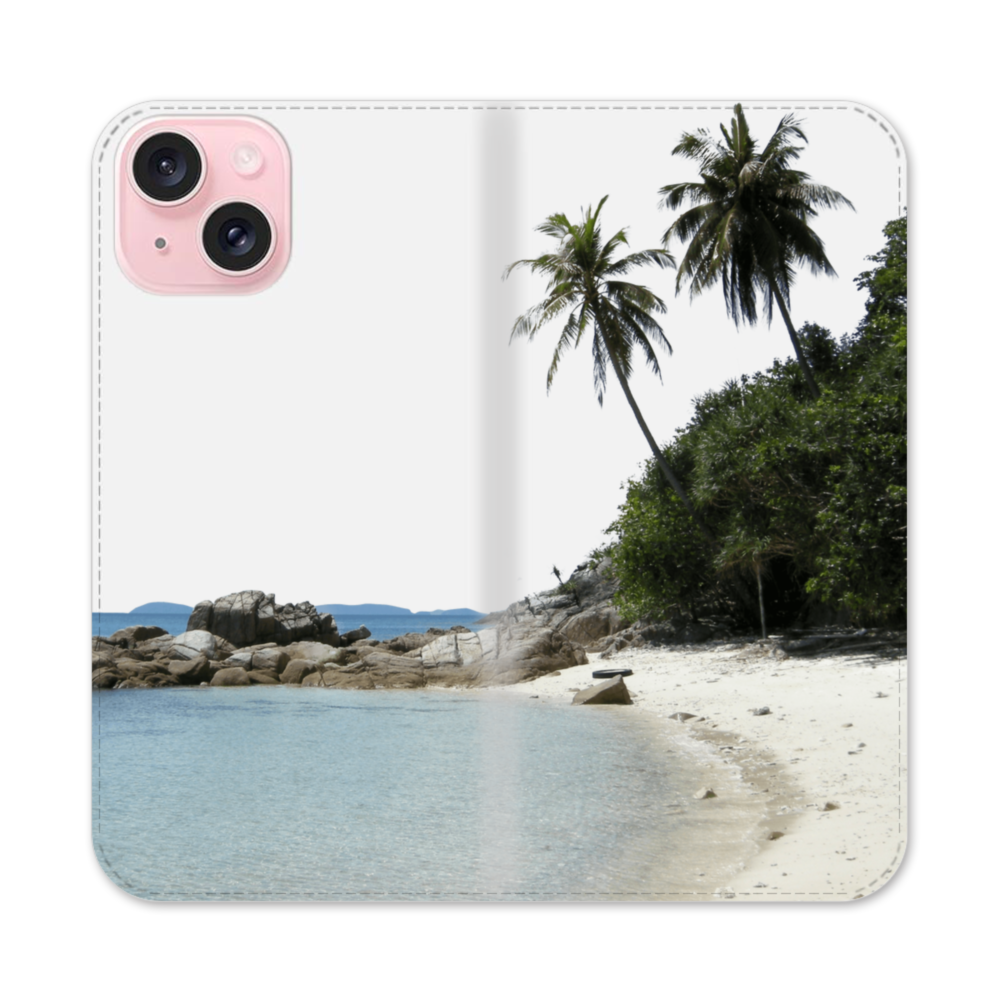Beach Palm iPhone 15 Flip CaseThis Beach Palm iPhone 15 Flip Case protects the back and screen of your iPhone 15 with a card slot on the inside front cover. Print extends to both front and back sides.