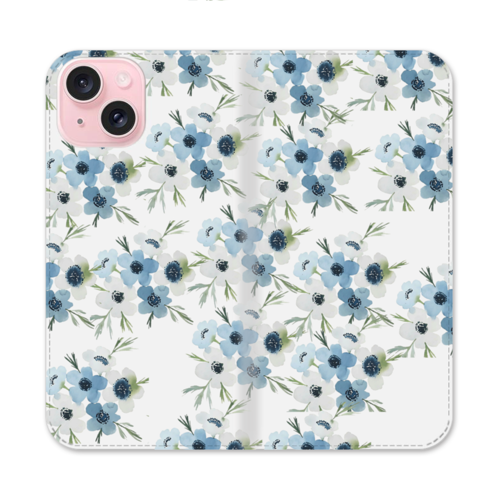 Blue Wild Flowers iPhone 15 Flip CaseThis Blue Wild Flowers iPhone 15 Flip Case protects the back and screen of your iPhone 15 with a card slot on the inside front cover. Print extends to both front and back sides.