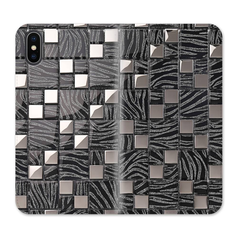 Silver Black Glass Mosaic Tiles iPhone XS Flip CaseThis Silver Black Glass Mosaic Tiles iPhone XS Flip Case protects the back and screen of your iPhone XS with a card slot on the inside front cover. Print extends to both front and back sides.