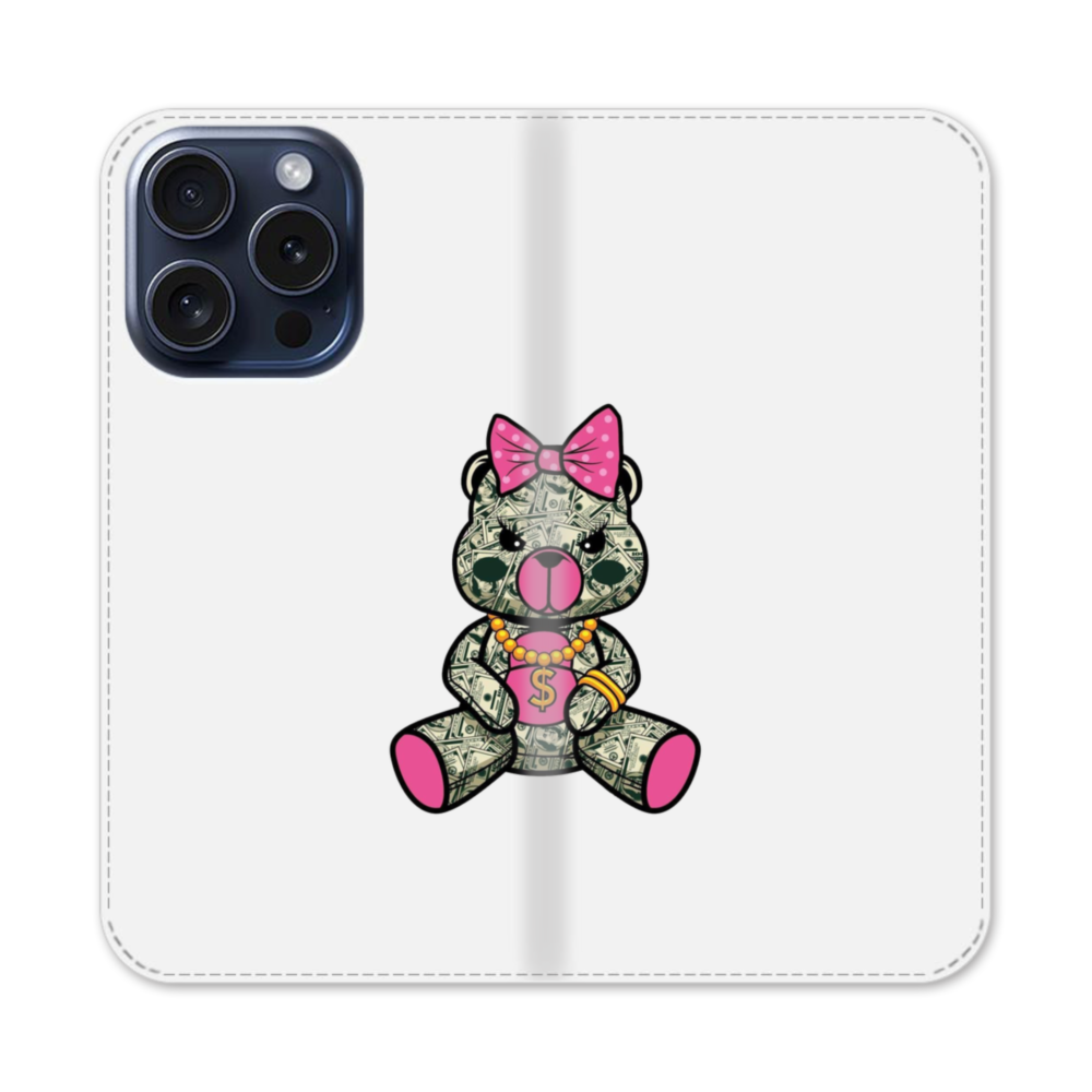 Cash Bear iPhone 15 Pro Flip CaseThis Cash Bear iPhone 15 Pro Flip Case protects the back and screen of your iPhone 15 Pro with a card slot on the inside front cover. Print extends to both front and back sides.