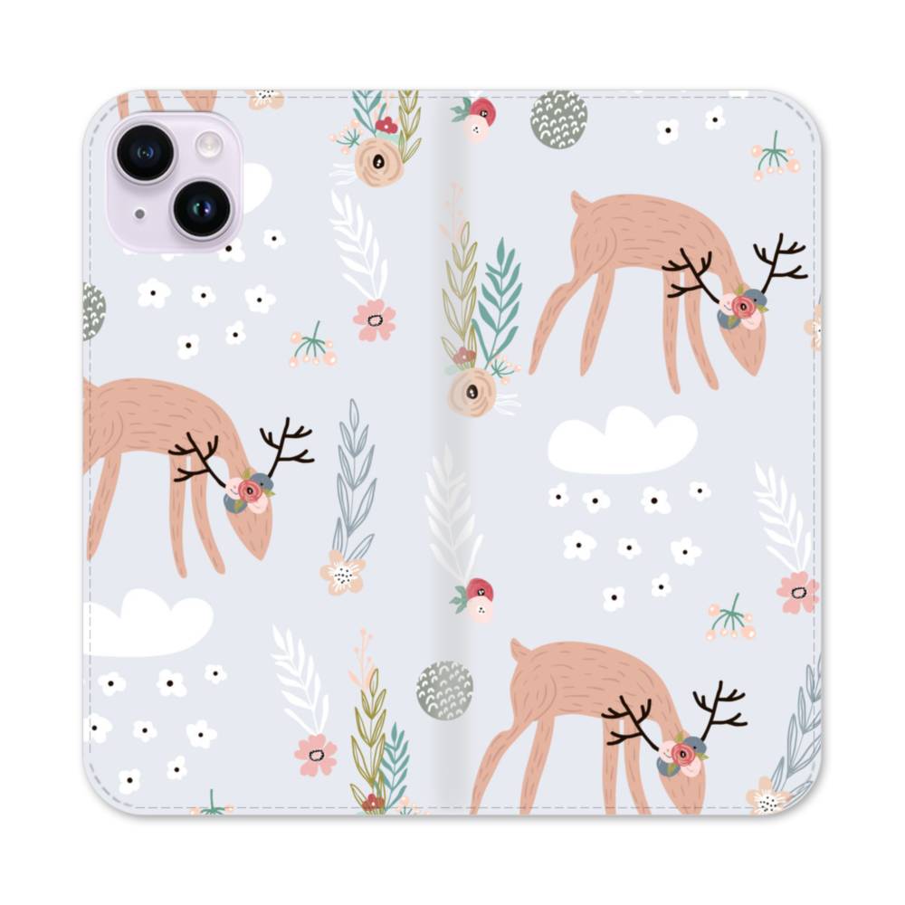 Floral Deers iPhone 14 Plus Flip CaseThis Floral Deers iPhone 14 Plus Flip Case protects the back and screen of your iPhone 14 Plus with a card slot on the inside front cover. Print extends to both front and back sides.