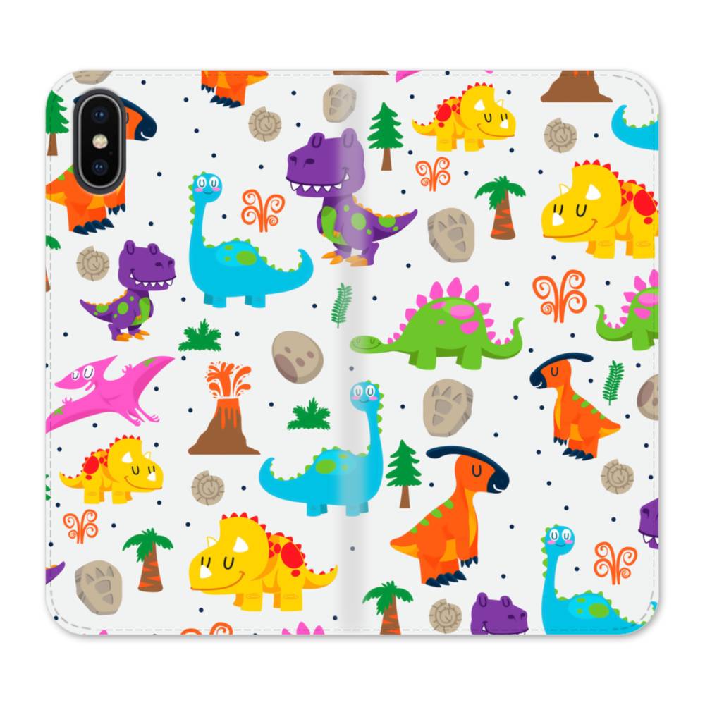 Cute Dinosaurs iPhone X Flip CaseThis Cute Dinosaurs iPhone X Flip Case protects the back and screen of your iPhone X with a card slot on the inside front cover. Print extends to both front and back sides.